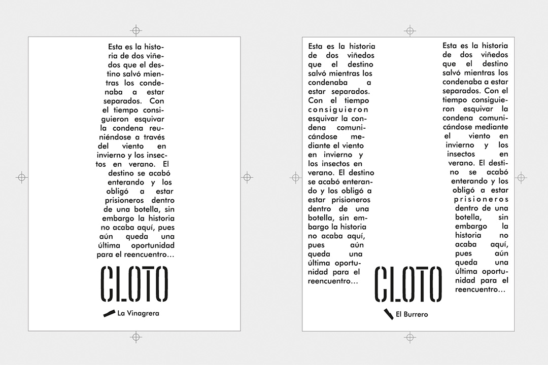 Con un único color y a partir de la plantilla que nos da la planta de cada una de las parcelas donde se sitúan los viñedos quisimos darle dramatismo a la composición utilizando los espacios vacíos que se invierten para cada vino y potenciar así la sensación de separación y encuentro.